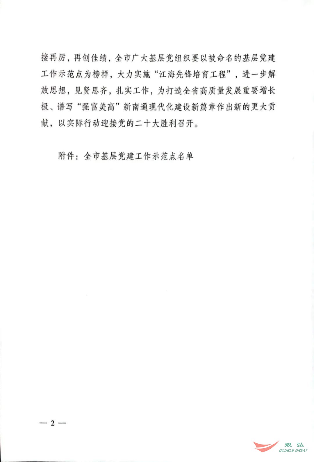 Baru -baru ini, Jabatan Organisasi Jawatankuasa Perbandaran CPC Nantong mengeluarkan dokumen yang menamakan 50 organisasi parti akar umbi sebagai tapak demonstrasi bangunan parti akar umbi di bandar. Jawatankuasa Parti Nantong Double Great Textile Co., Ltd. telah dianugerahkan gelaran "Tapak Demonstrasi Bangunan Parti Bandar Raya Bandaraya".