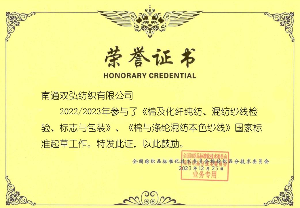 Sebagai Timbalan Setiausaha Agung Jawatankuasa Teknikal Kebangsaan untuk penyeragaman tekstil kapas dan Unit ahli Jawatankuasa Teknikal untuk Standardisasi Majlis Tekstil dan Pakaian Kebangsaan China, Double Great Company secara aktif mengambil bahagian dalam aktiviti standardisasi, mengambil bahagian dalam perumusan dan semakan pelbagai piawaian, mengambil inisiatif untuk melaksanakan penggubalan dan semakan piawaian, dan meletakkan banyak pendapat berharga. Beberapa cadangan inovatif telah diterima pakai dan dikuatkan, menjadi versi induk penggubalan standard. Syarikat besar berganda berturut -turut merumuskan 3 piawaian kebangsaan, 11 piawaian industri, 4 piawaian kumpulan, dan 3 Piawaian Penggunaan Unit Perdagangan Pemprosesan Kastam, dan memenangi gelaran Unit Lanjutan Kebangsaan untuk Piawaian Industri Tekstil dan Syarikat kebangsaan dengan sumbangan tertunggak kepada penyeragaman tekstil.