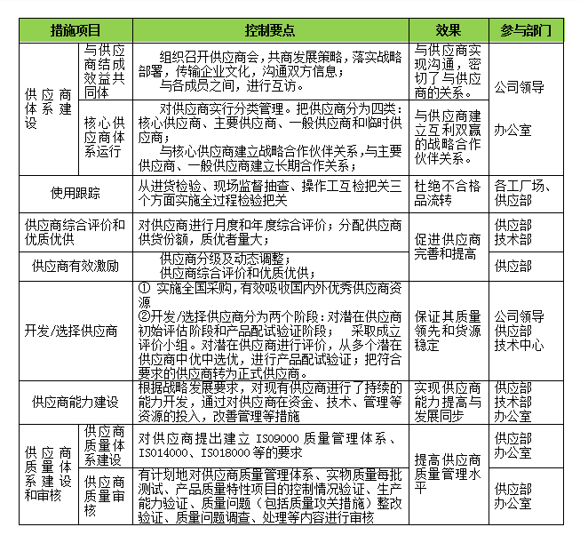 Gunakan langkah penilaian dan insentif bagi pembekal untuk mempromosikan peningkatan diri dan penambahbaikan berterusan pembekal; Memperkenalkan sumber pembekal berkualiti tinggi melalui pembangunan dan pembinaan pembekal, meningkatkan tahap pengeluaran dan tahap pengurusan pembekal sedia ada, mengurangkan kos perolehan, dan meningkatkan daya saing rantaian bekalan.